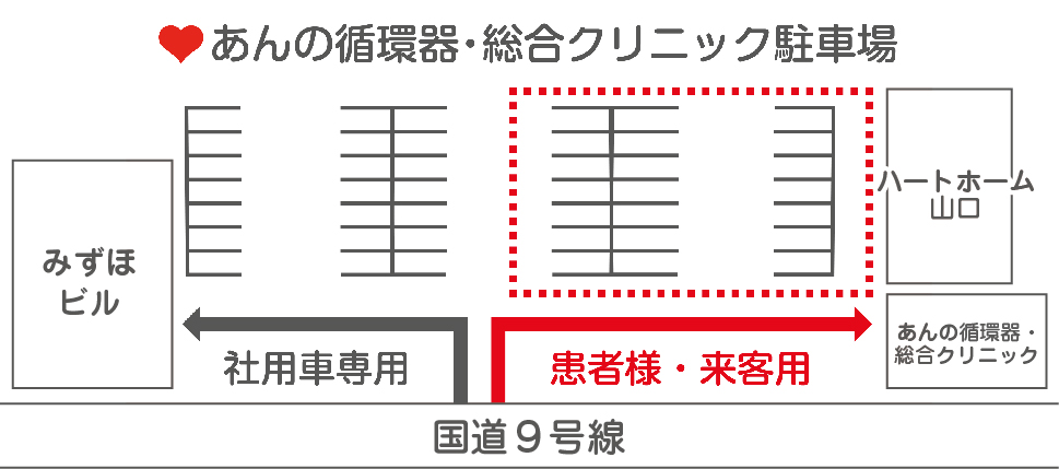 ・「患者様・来客用」エリア(赤枠部分) に駐車ください。